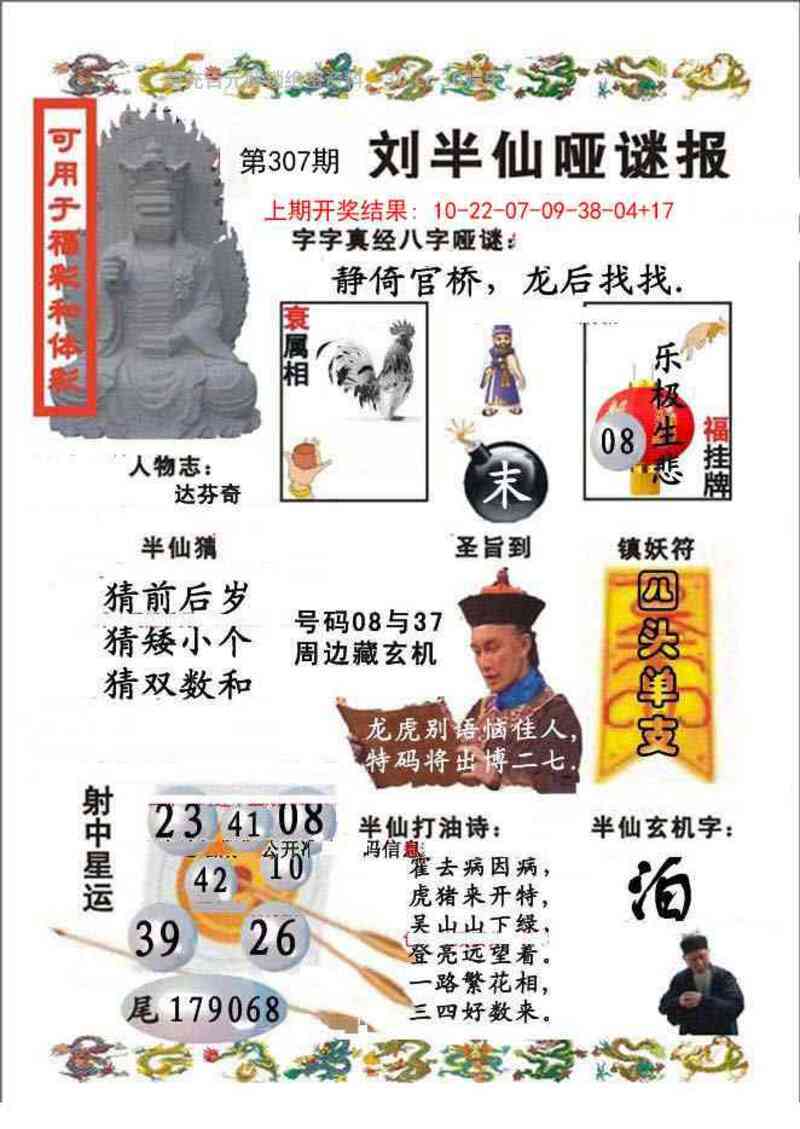 | 303期:兔合羊猴来,富可敌国对,鼠加大蛇发,谩红绫偷寄,马左猪右开,五八好数来 解:兔合羊猴来,富可敌国对,鼠加大蛇发,谩红绫偷寄,马左猪右开,五八好数来 【必中九肖】:兔羊猴鼠蛇马猪龙虎 【必中六肖】:兔羊猴鼠蛇马 【必中三肖】:兔羊猴 【必中一肖】:兔 【精选十码】:15.27.23.22.30.25.36.31.26.28 |
